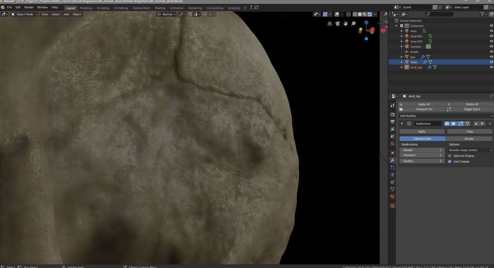 This is a Caucasian male skull I modeled in Zbrush, textured in Substance Painter and adapted to Cinema 4D and Blender.